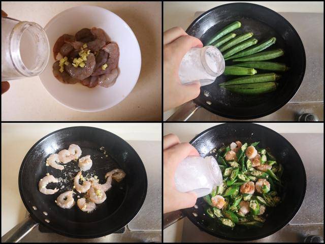 制作过程: 鲜虾去壳后挑出虾线, 加入少许盐、淀粉、料酒和姜末拌均匀腌制3分钟备用; 烧锅开水加入少许盐和几滴油,将秋葵整根放入锅中焯烫变色后捞出切成片,这样整根秋葵焯水能避免营养的流失。 烧热锅放入少许油,加入腌制好的虾仁进锅翻炒至变色,再将准备好的秋葵片放进锅中翻炒几下,最后加入少许盐调味,翻炒均匀即可。