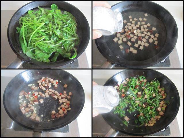制作过程: 将香干切成小丁,蒜和红椒切成细末备用; 烧锅开水,加入少许盐和几滴油,将萝卜樱菜放进锅中焯烫变色后捞出切成细末备用,再将香干丁放进锅中焯煮两分钟后捞出备用。烧热锅放入适量的油,加入少许蒜末和红椒末放进锅中煸炒香,加入香干丁放进锅中翻炒几下,再加入萝卜樱菜放进锅中翻炒几下,加入少许盐调味,翻炒均匀即可。