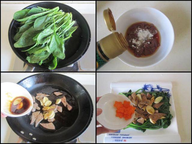制作过程: 烧锅水加入少许盐和几滴油,将洗净的菠菜放进锅中焯煮熟后捞出摆放在盘上。 猪肝片加入少许盐、淀粉、料酒和生抽等调味料拌均匀腌制一下, 调制好碗汁: 盐、淀粉、料酒、生抽和少许水拌均匀备用。 烧热锅放入适量的油,加入腌制好的猪肝片放进锅中翻炒至变色,倒入准备好的碗汁焖煮一下入味,将烧好的蚝油猪肝焦汁倒在焯熟的菠菜上,最后放入少许胡萝卜片点缀即可。