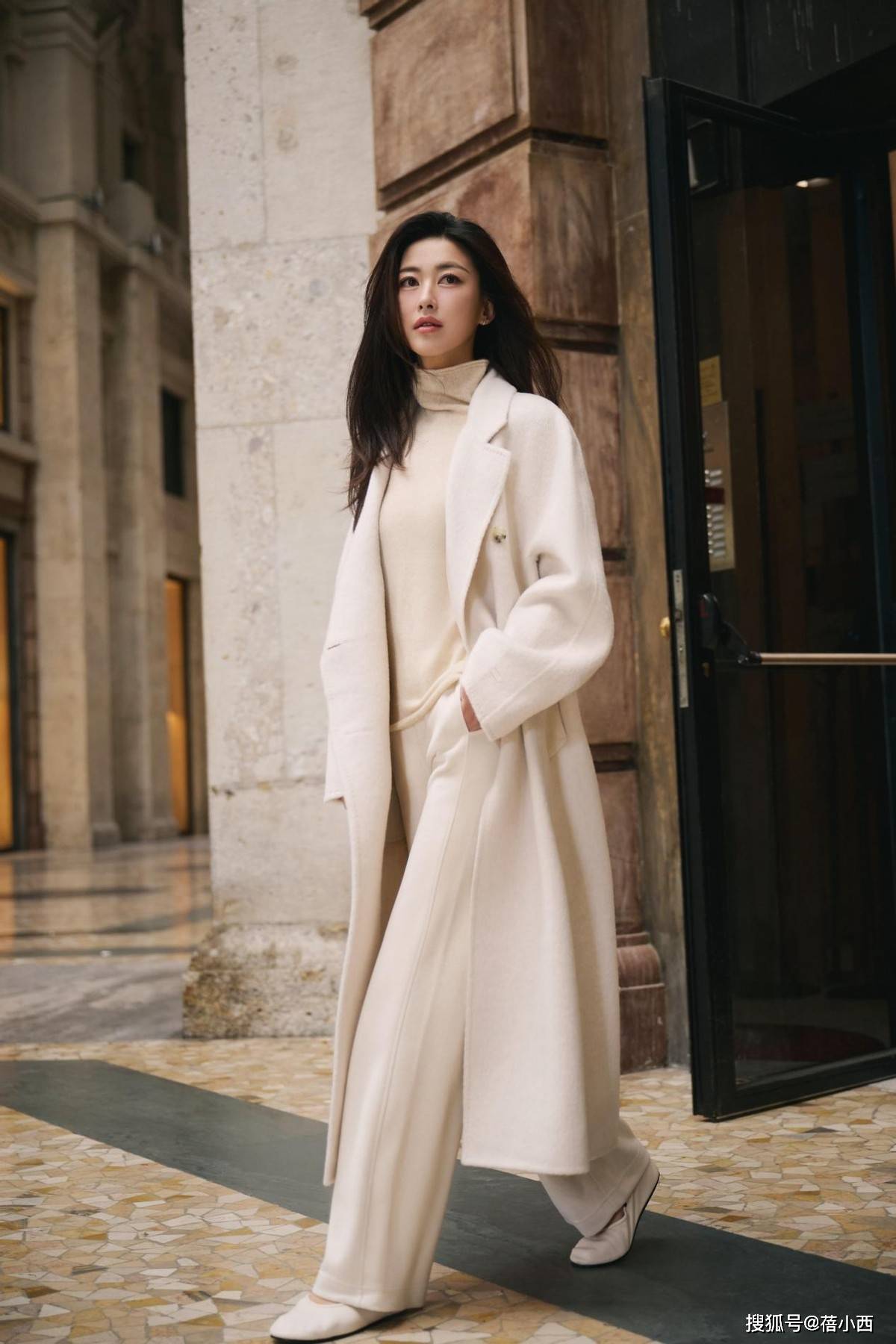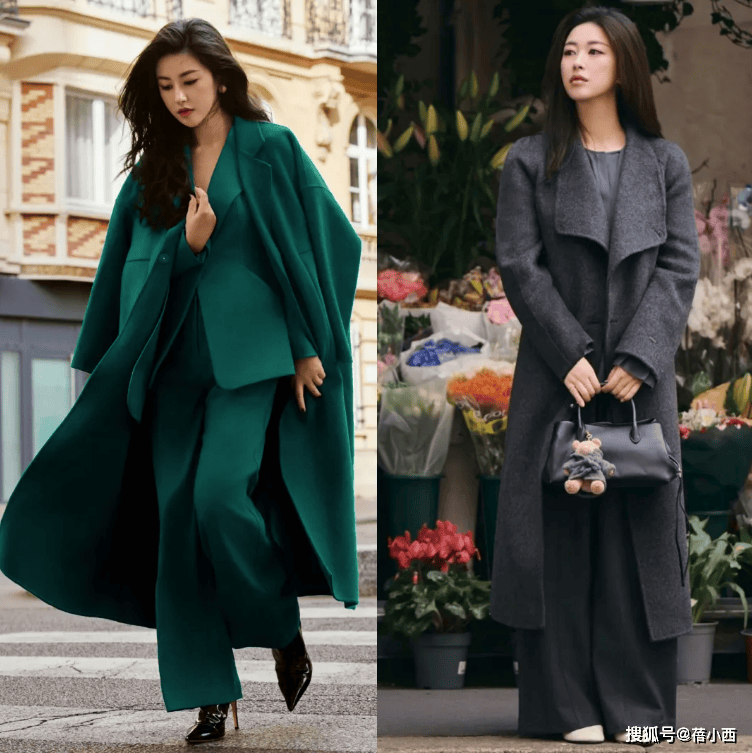 对于偏爱裤装的女性,朱珠的“大衣+阔腿裤和直筒裤”组合同样值得参考。她从不用紧身牛仔裤或运动裤搭配大衣,而是选择版型挺括、线条流畅的阔腿裤或直筒裤,裤长刚好盖住鞋面,露出纤细脚踝或搭配短靴,利落又显气场。
