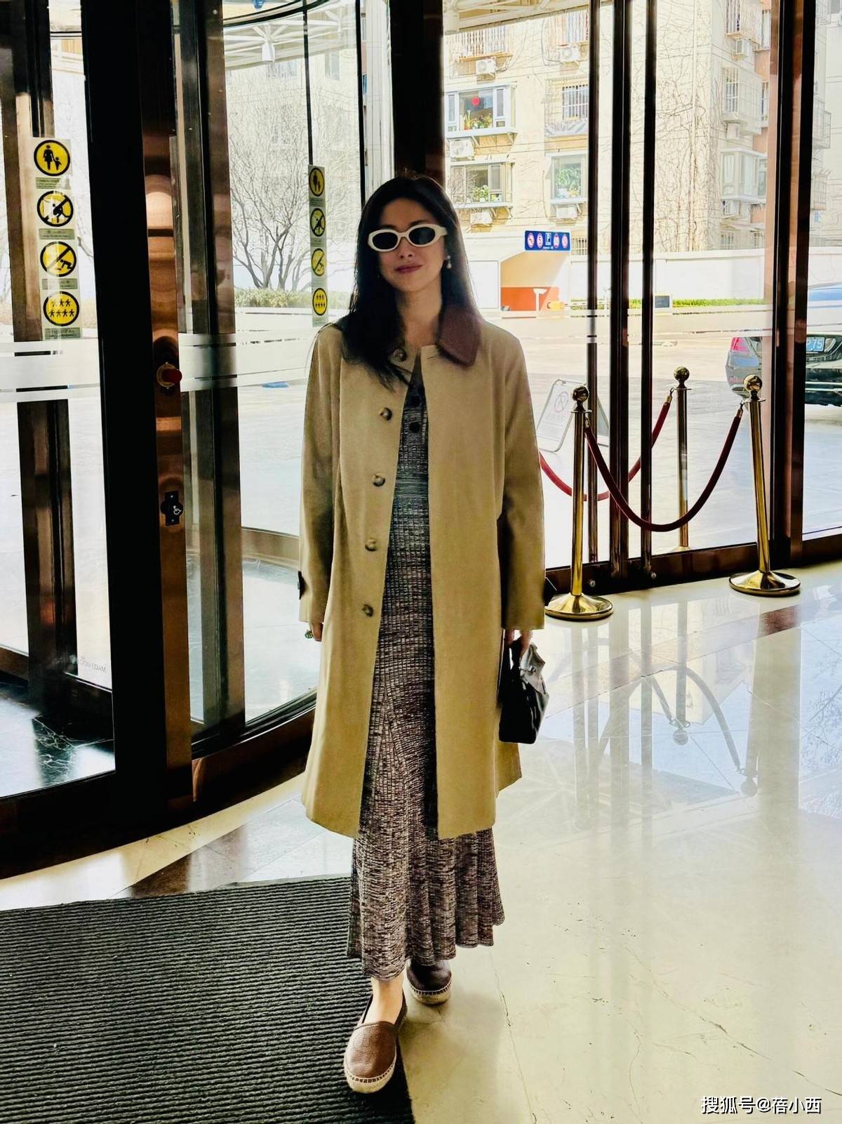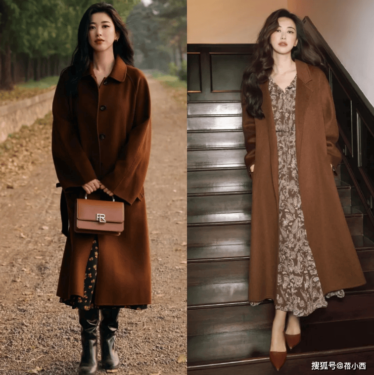 还有这一身棕色大衣搭配针织连衣裙,连衣裙的垂坠感中和了大衣的厚重,露出脚踝则拉长了腿部线条,整套搭配没有多余元素,却凭借材质与版型的和谐,把复古优雅的气质拿捏得恰到好处。