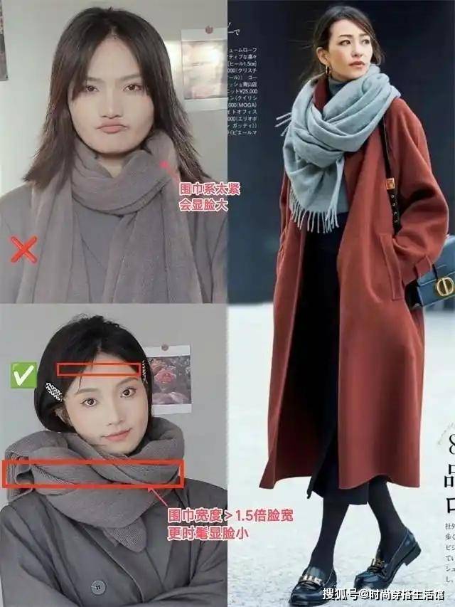 最后挑选围巾的时候还要注意宽度的选择,毕竟围巾的宽度和长度都太短、太窄的话,系在脖子上就很容易出现太紧的现象,从而造成脸部变大和变宽,拉低整体气质。那么最好的方式就是可以选择围巾宽度>1.5倍脸宽,这样能够更好的呈现出我们的脸部造型,视觉上更时髦和显脸小。