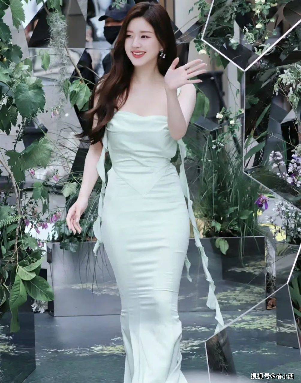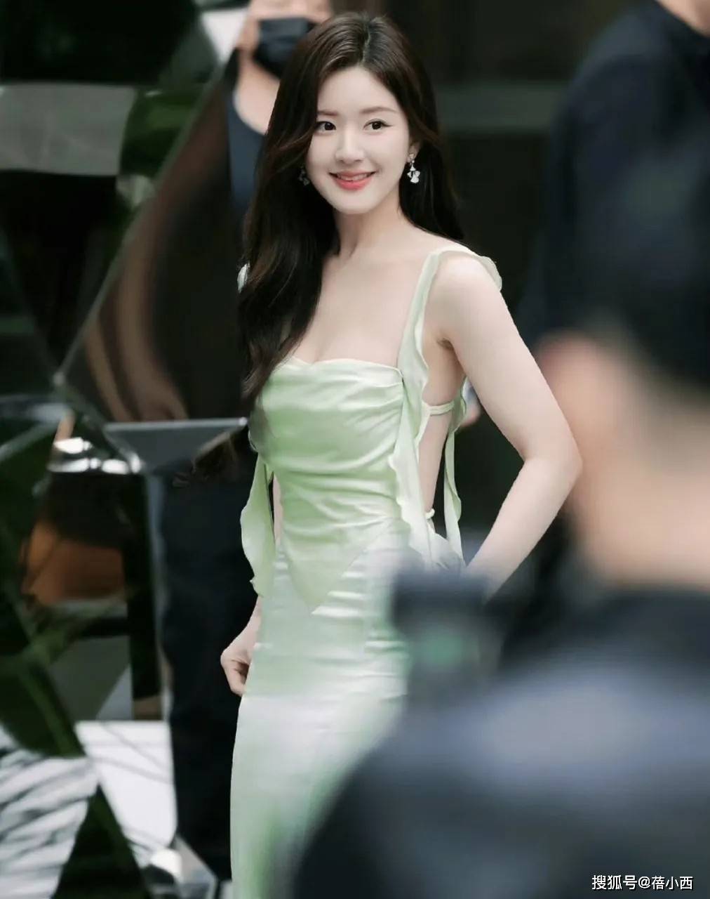 再来看这套薄荷绿缎面吊带裙,一出场就把“清新感和曲线美”捏得刚好。很多身材丰满的女生不敢碰浅色系紧身连衣裙,怕显臃肿,但赵露思选的薄荷绿是“低饱和浅调”,自带柔焦滤镜,不会像亮黄、浅粉那样有膨胀感,面料是垂坠感强的缎面,不是硬挺的西装料,贴着身材曲线但不紧绷,腰臀处的自然褶皱还能悄悄藏住小赘肉,走动时的光泽感又给清新感加了点“贵气”。