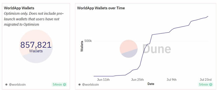 Worldcoin 上线后,Optimism 链上的 World App 数字应用数量激增。Dune Analytics 的数据显示,从 6 月初的不到 10 个,迅速增加到目前的 85 万多个 (857,821 个,不包括尚未迁移到 Optimism 链上的预发布数字应用)。其中,持有 WLD 代币的 Optimism 数字应用数量已达到 148,333 个。