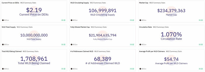 Dune Analytics 的数据还显示,目前 WLD 的价格为 2.19 美元,已申领的 WLD 代币总量已超过 170 万枚 (1,708,961 枚),申领代币的地址总数为 68,389 个,每位 WLD 代币领取者的平均收益为 54.74 美元。
