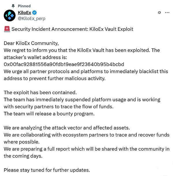 KiloEX,这个新兴的去中心化交易所,最近摊上大事了!他们官方发布声明,说平台受到了攻击,损失高达 750 万美元。目前,平台已经暂停运营,团队正在紧急追踪被盗资金的去向。
