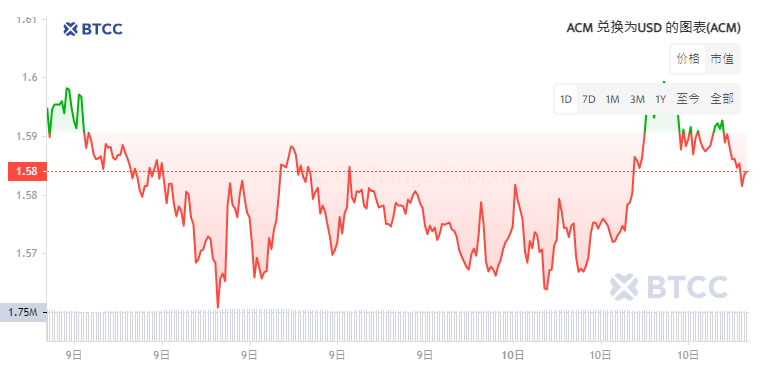 随着币价上涨,ACM市值达到$10,155,553,在所有加密货币中排名989。此外,其过去24小时交易量为$1,792,231,流通供给量为6,358,231 ACM。