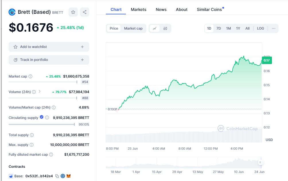 BRETT最近的价格走势令人瞩目。在经历了一段不确定的时期后,BRETT强势反弹,目前交易价格为0.167美元。今天早些时候,该代币甚至达到了0.172美元,然后略有回落,显示出其爆发潜力。这一波上涨是在BRETT拒绝了0.130美元的支撑位后发生的。然而,尽管拒绝了这一支撑位,市场动能似乎在减弱,这表明最初的兴奋可能正在消退。从更大的时间范围来看,BRETT仍然在一个区间内波动。4小时图表显示该代币处于不确定状态,价格在50期指数移动平均线(EMA)上下徘徊。尽管如此,交易者的兴趣丝毫未减。自昨天以来,现货交易量上升了53%,显示出交易者对BRETT的关注度正在增加。BRETT甚至在市值排名中超越了Book of Meme(BOME)。