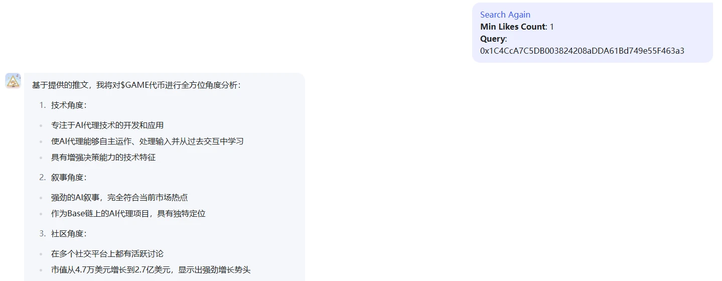 角度分析工具Find Angle,能够基于用户输入的合约,在X平台搜索推文并总结代币背后的概念,包括但不限于Virtuals Protocol生态代币,拥有公开信息的都能进行总结分析,但生成质量取决于公开信息的准确性与全面性。