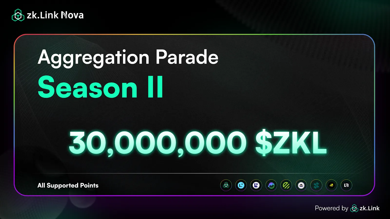 5月12日,zkLink推出Aggregation Parade Season II活动,总奖励数量为3000万ZKL。活动从2024年5月31日开始,至少3个周期,每个周期6周。用户可以通过持有资产(包括代币合并、轮盘和推荐)、现货及永续合约去中心化交易所、借贷、GameFi等参与zkLink Nova生态的交互来获得Nova Points,每周期结束后Nova Points可转化为ZKL代币并领取。不过,值得注意的是,官方对这次活动的门槛设计为0.1ETH或等值资金,未达到入场门槛将无法参与活动。