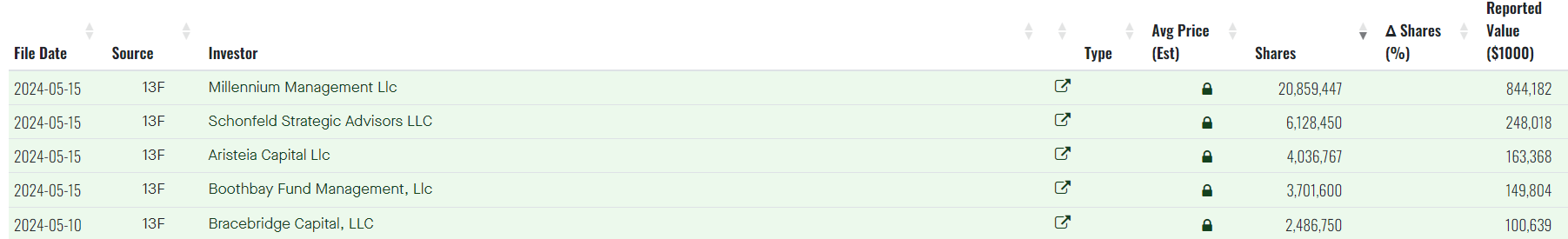 更让人惊讶的是,彭博ETF分析师Eric Balchunas分享的数据显示,在今年第一季度,共有高达414家机构投资了贝莱德的IBIT,这真是个惊人的成绩。其中,千禧管理(Millennium Management)持有价值8.44亿美元的IBIT,Schonfeld Strategy Advisors和Aristeia Capital分别以2.48亿美元和1.63亿美元的持仓位居第二、三名。