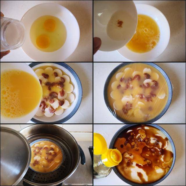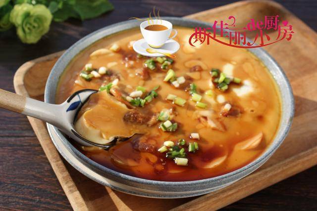 制作过程: 提前将干虾仁清洗干净后用冷水泡上十分钟; 鸡蛋加入少许盐打散备用,再加入泡干虾仁的水拌均匀。将日本豆腐切成小块整齐地摆放在盘中,上面撒上泡好的干虾仁, 再倒入准备好的鸡蛋液。 将菜盘覆盖一层保鲜膜,烧锅开水,将菜盘放进蒸锅中大火蒸上十分钟将其蒸熟。将蒸熟的鸡蛋羹拿出来, 均匀地撒上少许生抽、自豪吗香油和葱花既可。