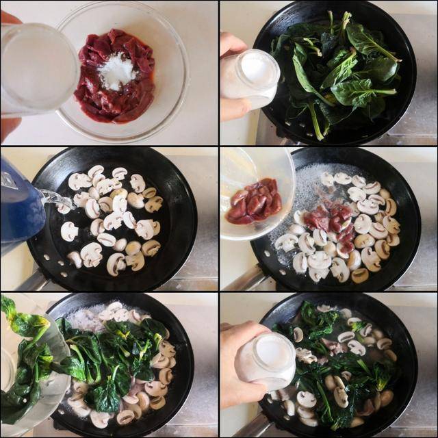 制作过程: 提前将猪肝和口蘑分别切成片备用。 猪肝片加入少许盐、生抽、淀粉和料酒等调味料拌均匀腌制5分钟。 烧锅开水加入1小勺盐,将菠菜放进锅中焯烫变色后捞出备用,这样能去除菠菜中所含的草酸。 烧热锅放入少许油,将口蘑片放进锅中翻炒几下,加入适量的水炖煮三分钟, 再加入腌制好的猪肝片煮至变色,加入焯好的菠菜,最后加入少许盐和胡椒粉调味既可。
