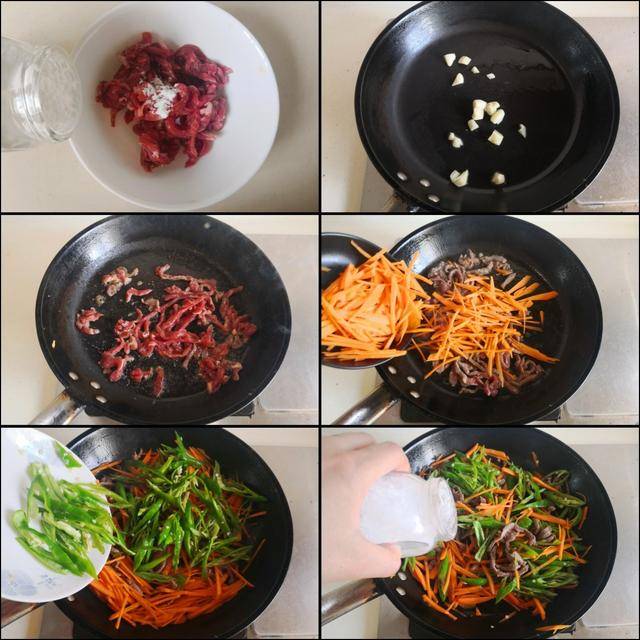 制作过程: 将准备好的牛里脊肉、青椒和胡萝卜分别切成细丝备用。牛里脊肉丝加入少许盐、淀粉、生抽、料酒和姜末等调味料拌均匀腌制五分钟备用; 烧热锅放入适量的油,加入腌制好的牛肉丝放进锅中翻炒至变色,加入准备好的胡萝卜丝放进锅中翻炒至微微发软,加入青椒丝放进锅中翻炒至变色,加入少许盐调味,翻炒均匀即可。