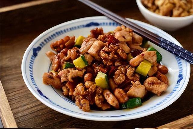 制作过程:将鸡腿肉切成丁 黄瓜和胡萝卜也切成丁; 大葱干辣椒切小段,姜蒜切片备用。 鸡腿肉丁加入适量的盐、料酒、酱油和淀粉腌制10分钟。调整好碗汁: 糖3匙、生抽2匙、醋1匙、干淀粉1匙、料酒1匙再加入2匙水调成料汁待用。 先用少许油炒核桃仁煸炒香后盛出备用。锅中放入适量的油,将腌好的鸡丁倒入锅中翻炒至变色,再将葱姜蒜和红干椒放进锅中爆炒香,再加入黄瓜丁和胡萝卜丁爆炒几下,加入准备好的调味料汁 大火翻炒均匀,再焖上两分钟后大火收汁,最后出锅前倒入炒过的核桃仁翻炒均匀既可。