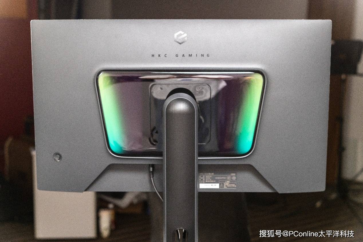 转到背面,与正面极简、追求高屏占比的设计理念形成对比,HKC GS27QKS 的背面则毫不掩饰地释放出强烈的电竞基因和力量感。显示器背板主体采用了深灰色的主体配色,营造出沉稳而扎实的质感。