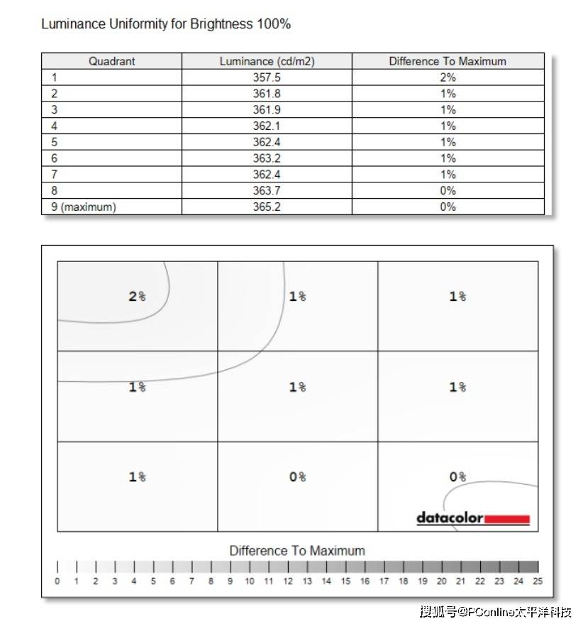 而在亮度均匀性方面,HKC GS27QKS 在 100% 亮度下最大差值仅为2%,表现同样出色。如此微小的差异,肉眼已极难察觉,证明了这块QD-OLED屏幕显示的高度一致性。