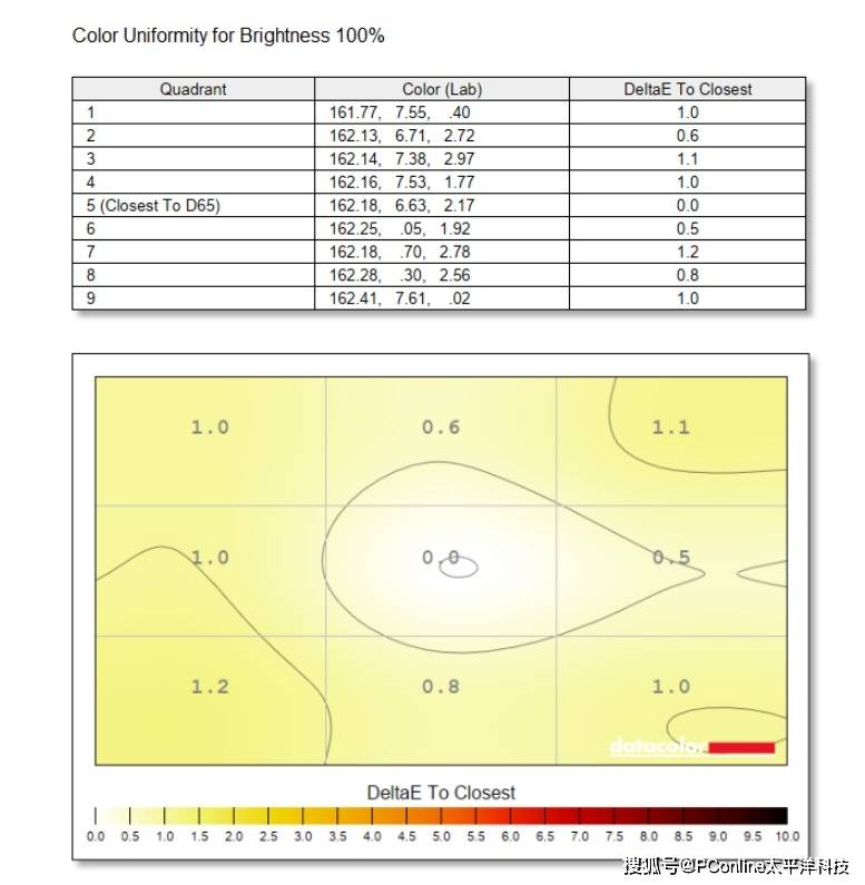 最后是屏幕均匀性测试,在色彩均匀性方面,HKC GS27QKS 表现优秀。在 100% 亮度下,屏幕各象限的色彩差异Delta E的最大值仅为 1.2,整体偏差极小,呈现出高度均匀的色彩分布。