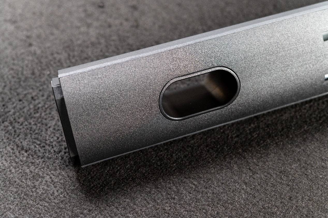 而整个背面最醒目的当属位于中央的梯形镜面区域。这个区域是整机视觉的焦点,它内置了炫酷的 RGB 电竞氛围灯,巧妙的打破了背板的沉闷,为桌面增加了氛围。