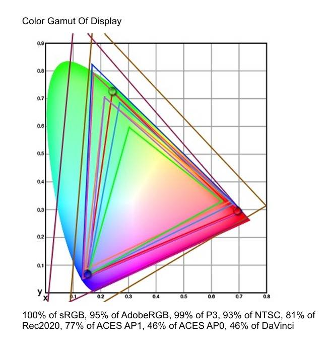同时,色域容积更是达到了 162.6% sRGB、112.0% Adobe RGB 和 115.1% DCI-P3,这组数据明确展示了OLED面板色域广的特性,完全能满足专业图像处理和视频剪辑等对色彩有极高要求的应用。