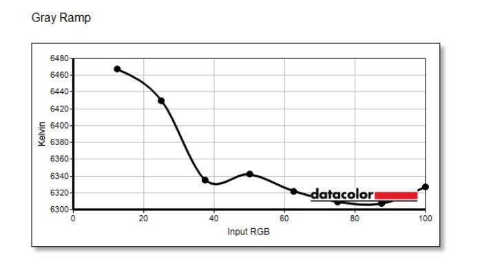 而在灰阶色温测试中,HKC GS27QKS 的表现在中高亮度区间保持稳定。色温在 10% 灰阶时约为 6550K,在 20% 灰阶时下降至 6250K 左右,随后在 40% 至 100% 亮度区间则保持得相当平稳,基本维持在 6250K 的水平。