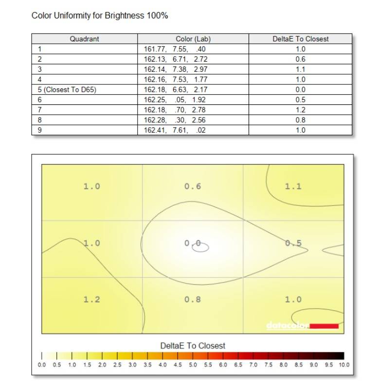 最后是屏幕均匀性测试,在色彩均匀性方面,HKC GS27QKS 表现优秀。在 100% 亮度下,屏幕各象限的色彩差异Delta E的最大值仅为 1.2,整体偏差极小,呈现出高度均匀的色彩分布。
