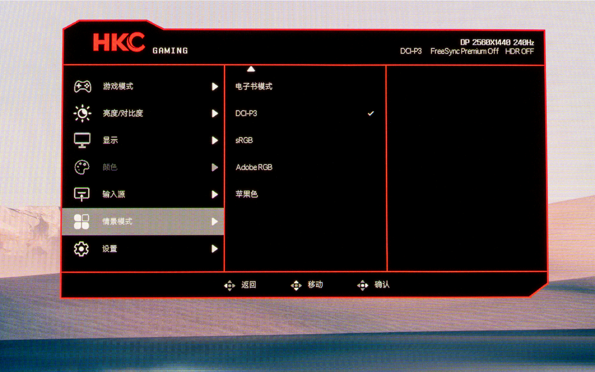 当然,针对高色域覆盖可能带来的过饱和问题,HKC GS27QKS还提供了对应色彩空间的色域缩限功能,只需在OSD菜单中将显示器调整到对应色彩空间的情景模式,即可将色域缩回对应范围内。