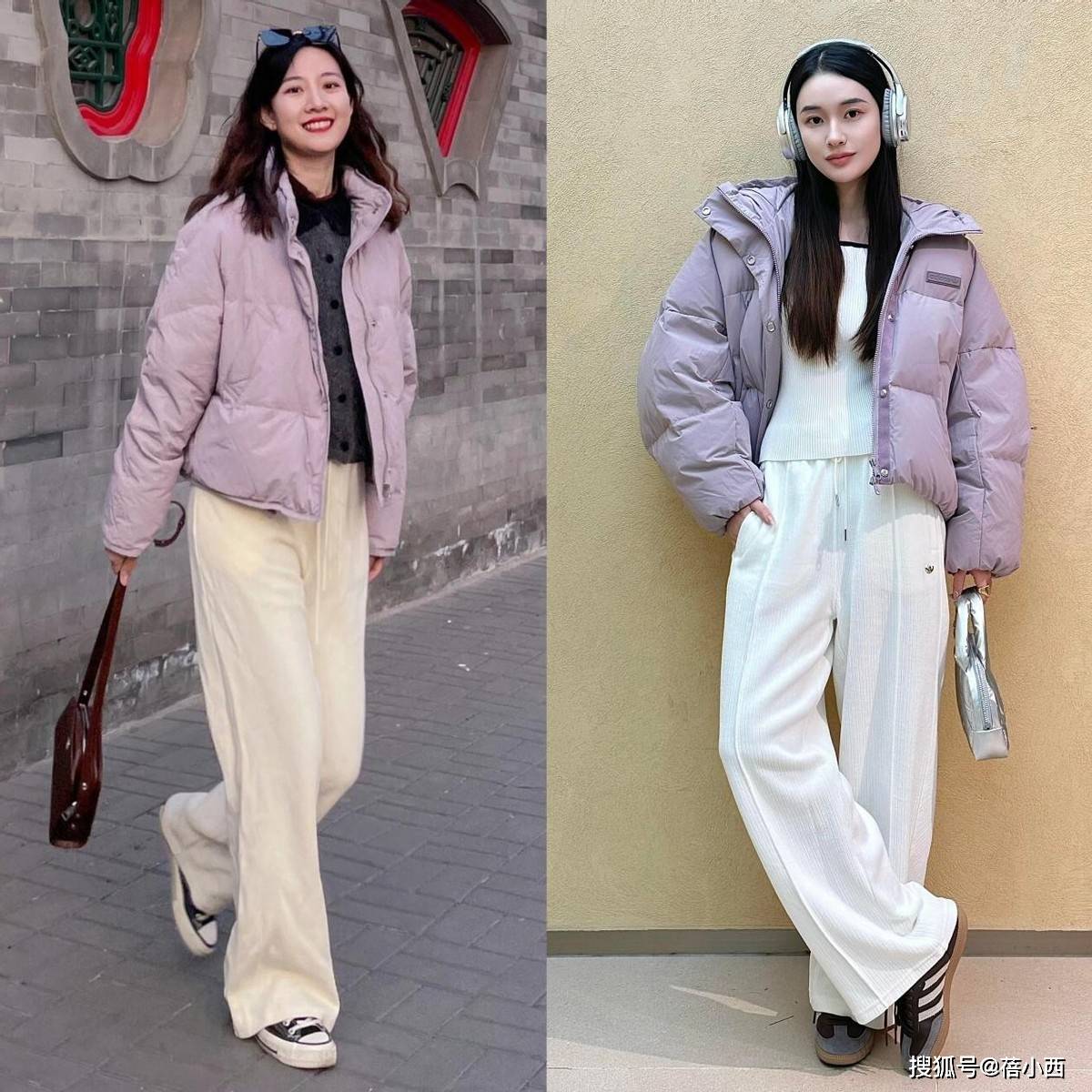 短款面包服是冬天的“显高神器”,用紫色的面包服搭配高腰小白裤,可以瞬间拉出三七分比例,浅色系的服饰降低了视觉上的压抑感,能让整体造型清爽又有活力,完全看不出羽绒服的臃肿感,适合日常出街、约会,保暖又时髦。