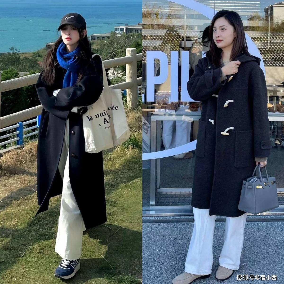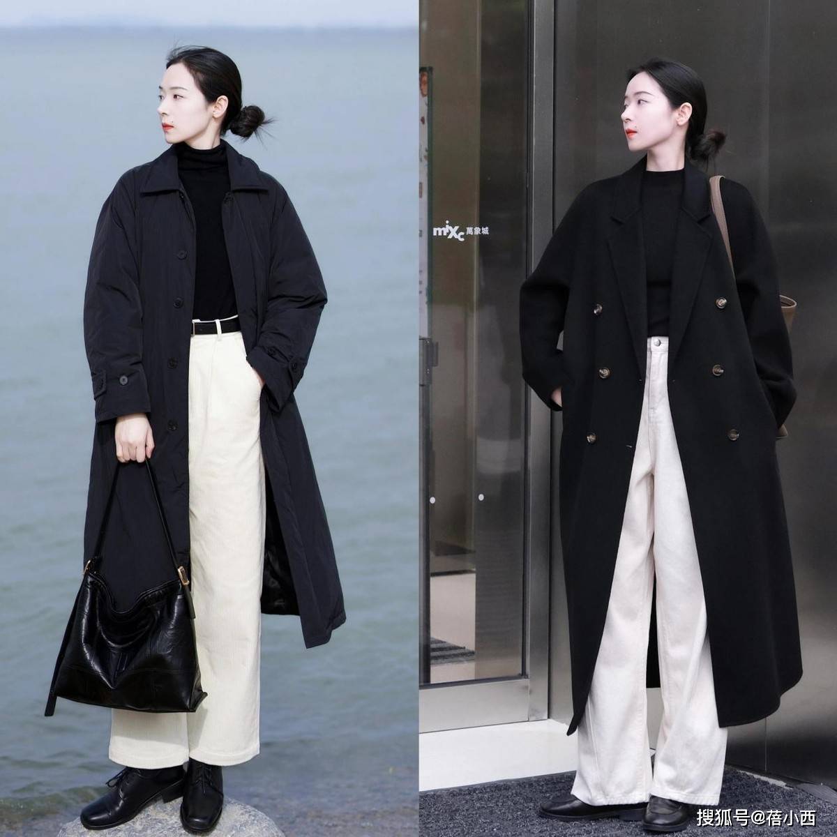 秋冬季节,黑色大衣虽然百搭,但容易显得沉闷压抑,这时小白裤就能发挥“提亮”的作用。黑色毛呢大衣搭配小白裤,黑白撞色经典又大气,大衣的挺括感与小白裤的利落感完美呼应,撞色之间尽显时尚张力,适合追求个性的职场女性。