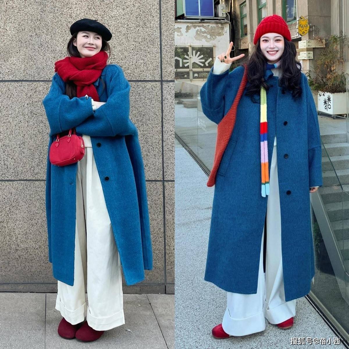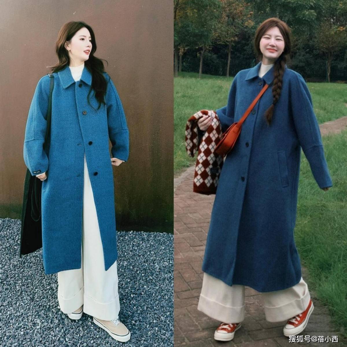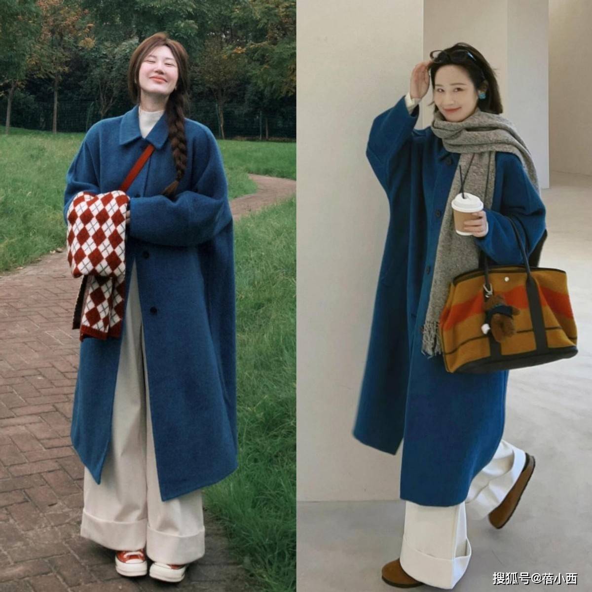 深蓝色大衣自带柔和滤镜,中等身材的姐妹们可以选长款过膝版型,垂坠感十足,搭配高腰阔腿小白裤,裤脚宽松,搭配平底鞋,整套搭配简约又大气,凹造型穿既有气场又不压抑,松弛感直接拉满。