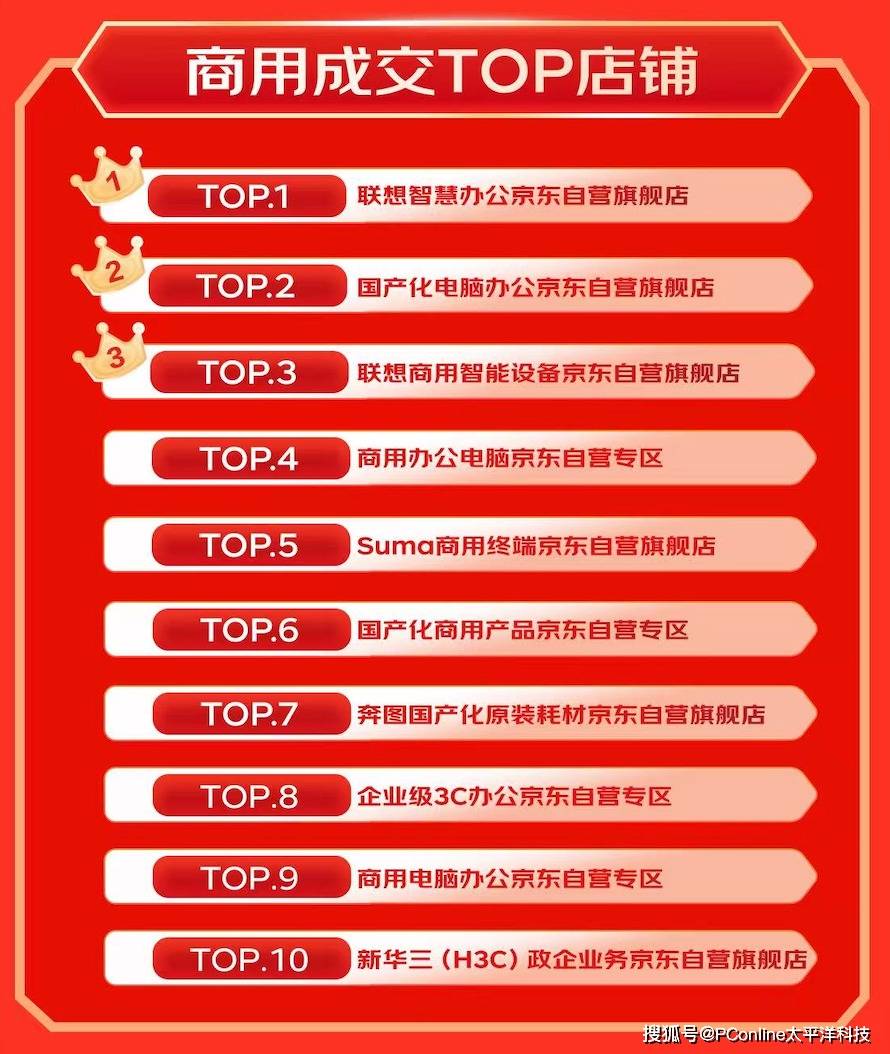 店铺成交排名同样反映出企业用户对服务与正品保障的重视。联想智慧办公京东自营旗舰店、国产化电脑办公京东自营旗舰店、联想商用智能设备京东自营旗舰店位列前三,Suma、奔图、H3C等品牌店铺亦进入前十,展现出京东自营渠道在企业客户中的信任度与影响力。