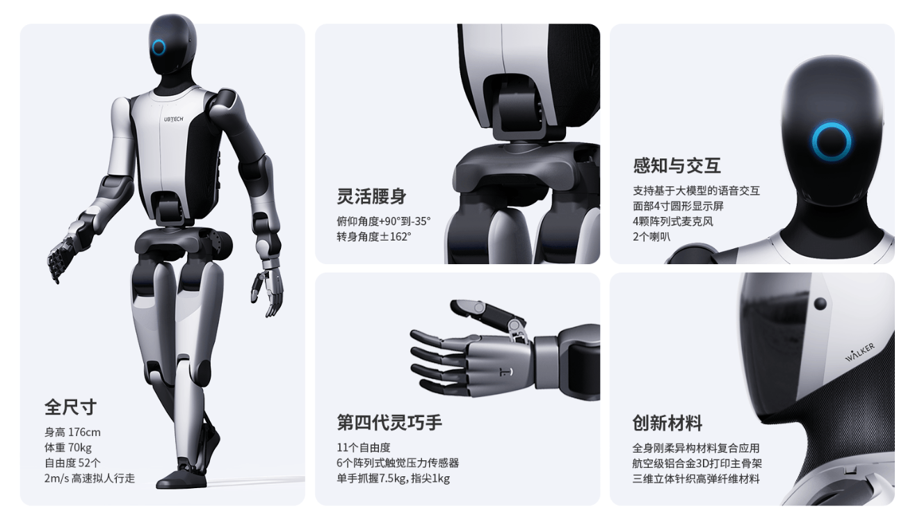 据官网信息显示,Waliker S2 是优必选全新一代工业人形机器人,也是全球首个实现自主换电的人形机器人,其身高 176cm,体重为 70kg,高速拟人行走可达 2m/s。它集成了第四代工业级灵巧手与仿生手臂,能完美复现拟人步态行走与精细操作。其灵巧手可实现亚毫米级操作,耐久性测试超过 8 万次;52 个自由度的躯体使其能在 0-1.8 米空间内完成 15 公斤负载搬运及灵活转动。