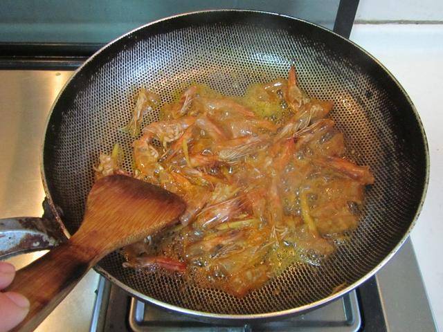 2. 烧热锅放入适量的油,将剥下来的虾壳放进锅中煸炒出红油后,再将虾壳捞出;