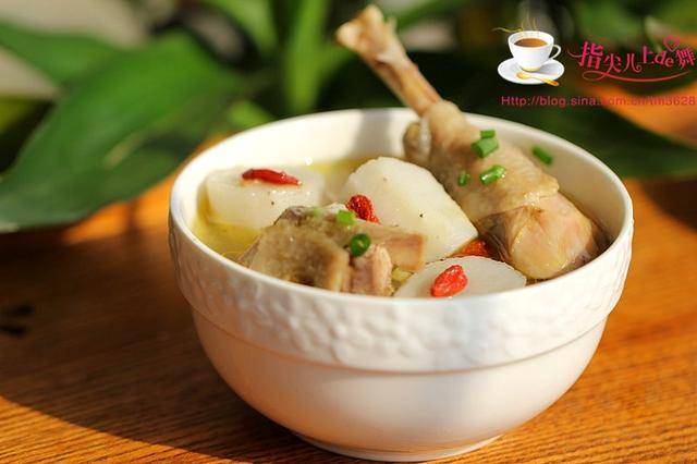 推荐菜谱【山药鸡汤】原料:山药 1根 土鸡1只 姜片 少许 枸杞1小把 胡椒粉 少许 葱花 少许 盐 适量