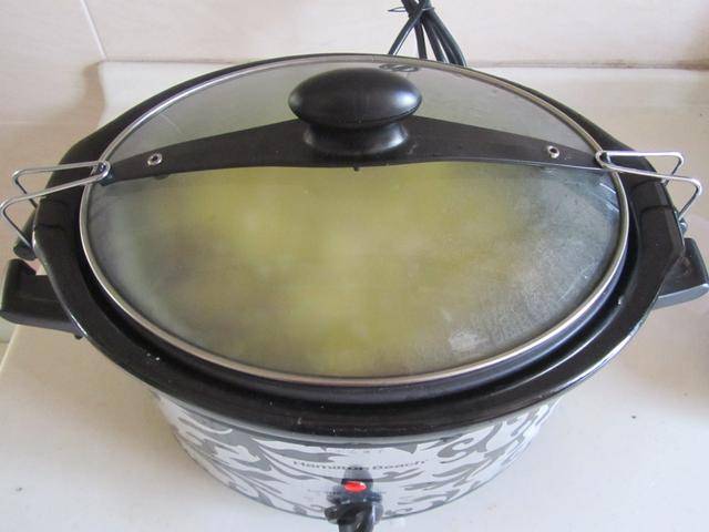 2. 将炒过的鸡块放入慢炖锅中,加入适量的水,加盖继续炖煮;