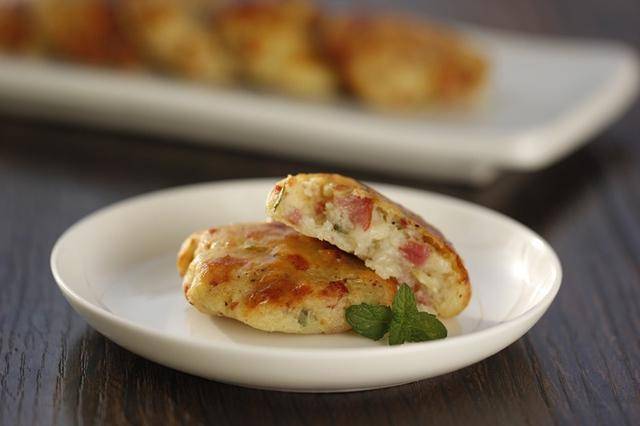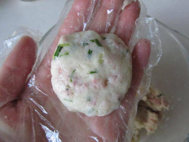 3. 戴上一次性手套,将少许培根土豆泥揉搓成小圆球,按压成饼; 如果不戴手套,可以在手上涂抹少许油,避免粘连;