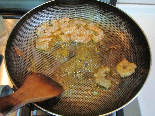 3. 将腌制好的虾仁锅中翻炒,翻炒至微微变色;