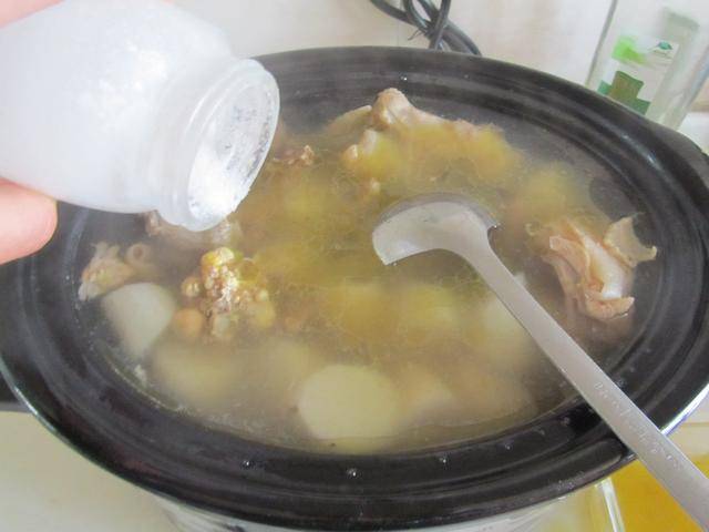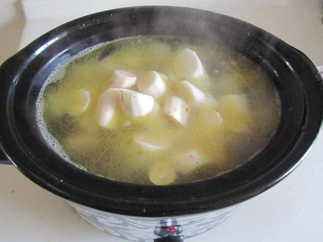 3. 炖煮约一个小时后,将准备好的铁棍山药段放进慢炖锅中继续炖煮;