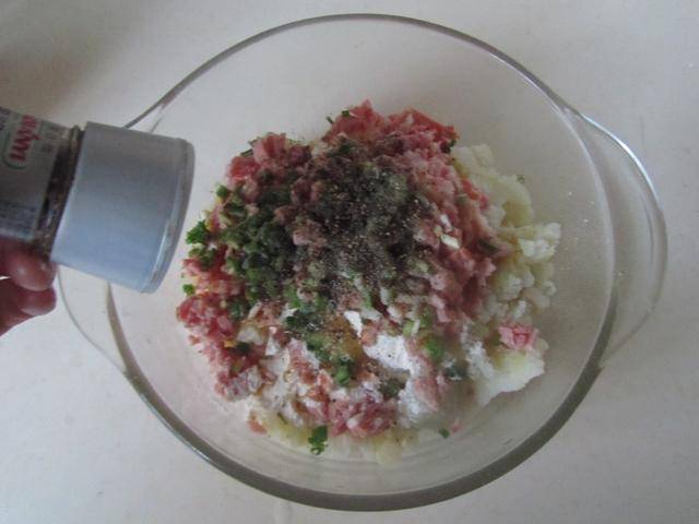 2. 将土豆泥放至微微凉,将培根片切成小丁后放入土豆泥中,加入少许盐、葱花、胡椒粉等调味料拌均匀;