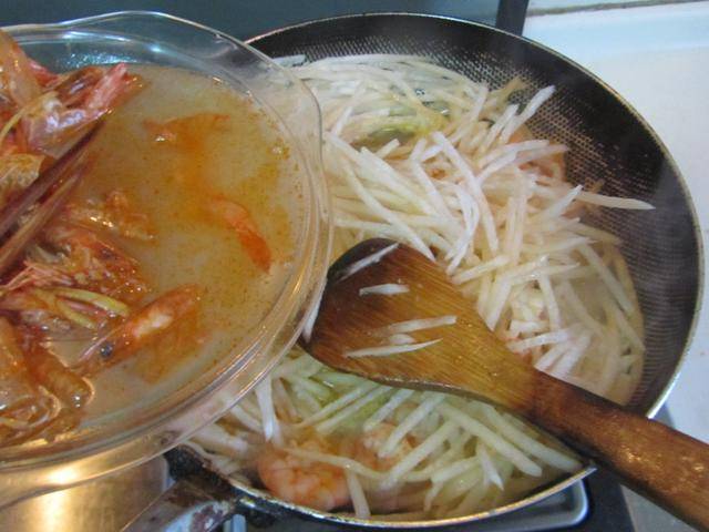 4. 加入准备好的白萝卜丝放进锅中翻炒几下, 加入适量的水炖煮;