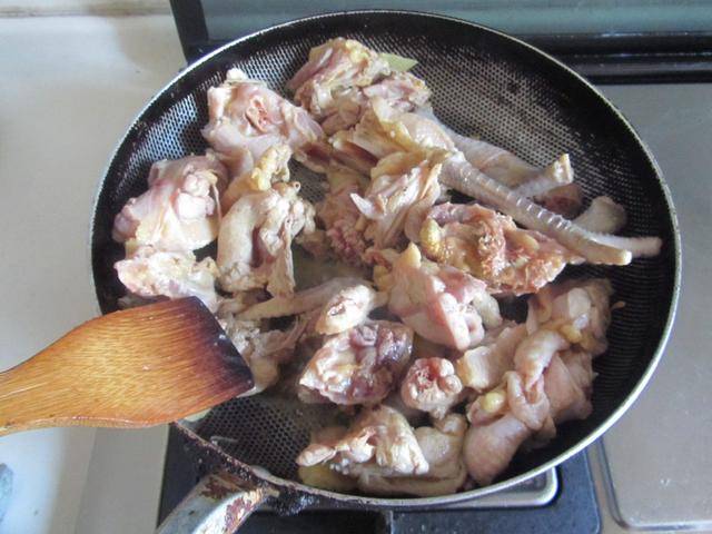制作过程: 1. 烧热锅放入少许油,将土鸡块放进锅中去煸炒,炒干水分后加入少许姜片继续翻炒,至表面微微发黄;