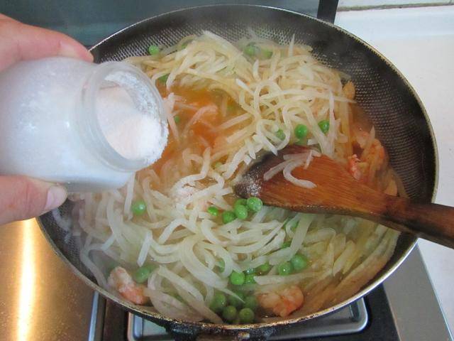 5. 加入少许豌豆进锅配色, 一起煮至萝卜丝微微变色, 再加入少许盐和胡椒粉调味即可。