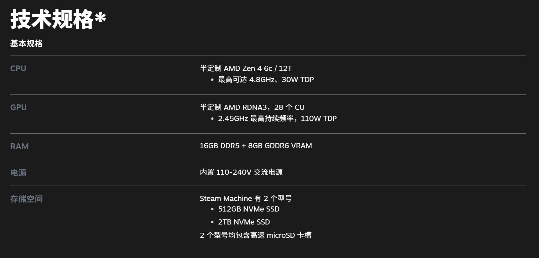 所以仅从CPU和GPU来看,我们可以将Steam Machine当作是一台R5 7640HS或R5 220+超频版RX 7600M的迷你主机,至于Vavle对其4K 60Hz游戏的描述,个人觉得有些过于乐观了,至于一些3A游戏想要跑到这种程度只有拉满超分+拉低画质了,个人觉得不如降低分辨率再拉高些画质视觉效果更好。