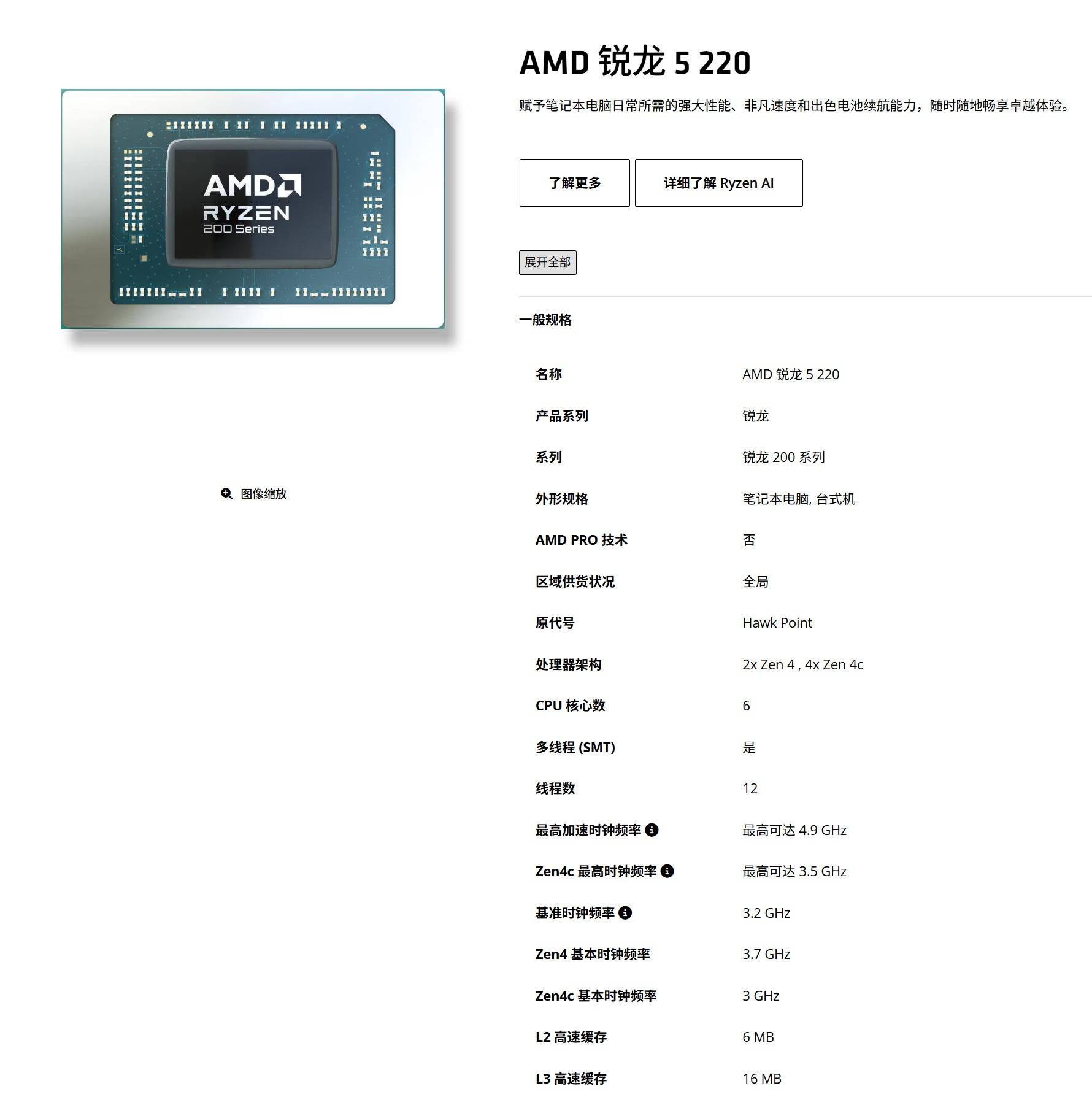 不过Zen4架构、6核心12线程,符合这两个参数的移动端处理器并非只有R5 7640HS一款,还有一款较为冷门的AMD R5 220也符合该规格,R5 220为一款较为低端的入门级别处理器,采用大小核混合架构,目前主流消费级轻薄本中只有HP的8代战66搭载了该处理器。规格上R5 220拥有2个Zen4大核心+4个Zen4c小核心,其中Zen4大核最大4.9GHz,Zen4c小核心最大3.5GHz,三级缓存16MB,cTDP为15~30W,看起来好像是更符合Steam Machine中的这颗半定制CPU。