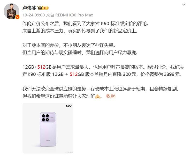 从近期厂商的市场反应来看,这一点也得到了印证。以卢伟冰在微博中提到的红米K90标准版为例,由于用户对价格敏感、市场竞争激烈,选择将12GB + 512GB版本主动降价300元至2899元,这一举措实质上反映出当前主流机型仍在以“让利”的方式应对成本上升前的价格窗口期。换句话说,厂商在内存、存储价格全面上扬前,正尽力释放性价比红利以刺激换机需求。