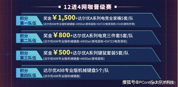 积分第一队伍:将获得1500元现金奖励加上达尔优A系列电竞全家桶(每队5套A98专业版机械键盘+A950air游戏鼠标+EH722电竞耳机+H100游戏手柄)