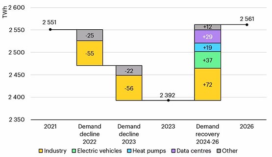 IEA 指出,之前的经济低迷和通货膨胀导致发达经济体的制造业和工业产出下降,从而抑制了电力需求的增长。但随着经济前景的改善,加上数据中心、AI 和加密货币行业的快速扩张,电力需求预计将迎来爆发。尤其是在发达经济体和某个东方大国,电气化转型和数据中心建设将进一步推高电力消耗。报告预测,到 2026 年,全球数据中心的电力消耗将达到 1000TWh,而 2022 年的数字是 460TWh。这增长速度,简直是“电老虎”啊!