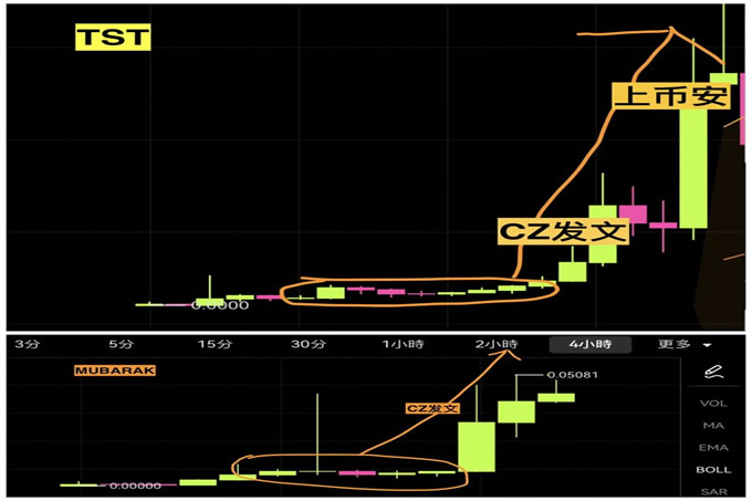 想知道 Mubarak 有没有戏,先看看前辈 TST 是怎么火起来的。今年 2 月,TST 可是风头正劲,它的成功也离不开 CZ 的助力。当时,TST 上线才三天,价格走势眼看着就要平稳了,结果 CZ 突然发了条消息,直接引爆了市场,价格一路飙升,市值翻了好几十倍。TST 的故事很简单:新平台测试币,没啥乱七八糟的背景,干净清爽,一下就赢得了投资者的信任。