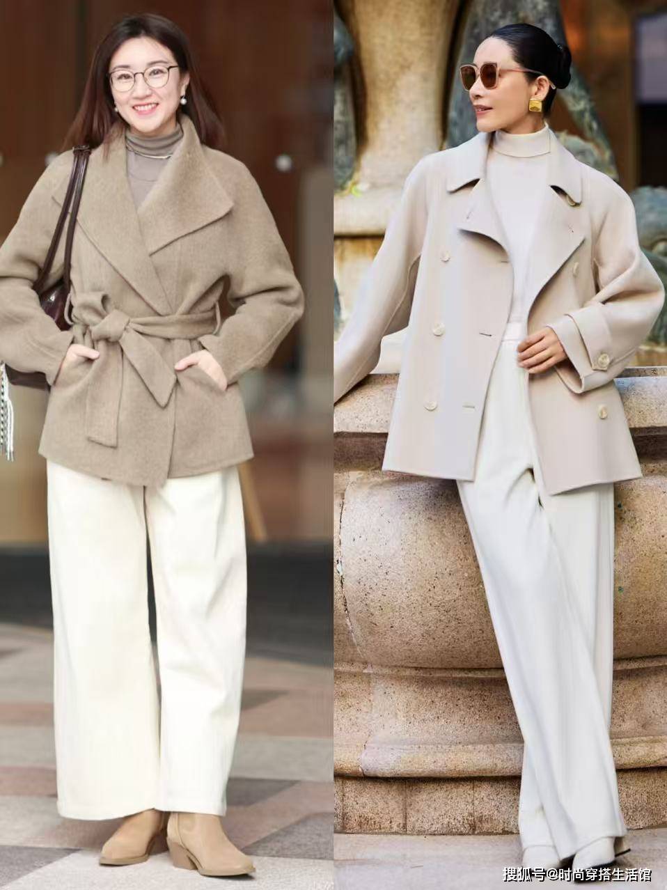 最后对于冬天来说我们选择穿短外套搭配阔腿裤不仅可以缩短上半身比例,同时还能完美的强调出腰线,尤其是短外套能够完美的分割身材比例,搭配上高腰的阔腿裤,完美的塑造出三七分比例,整体造型会更加的利落和干练。