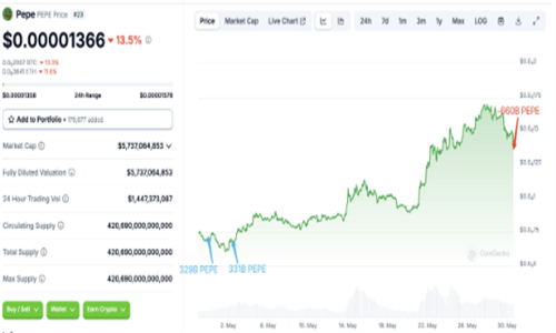 据了解,这位佩佩鲸在一个月前用952万美元买入了66.7亿枚佩佩代币。到了5月30日,他把这些代币全部存入了一个著名的交易平台,并成功套现了495万美元。这不仅展示了他对市场的精准判断,也让大家对佩佩代币的未来走势更加关注了。